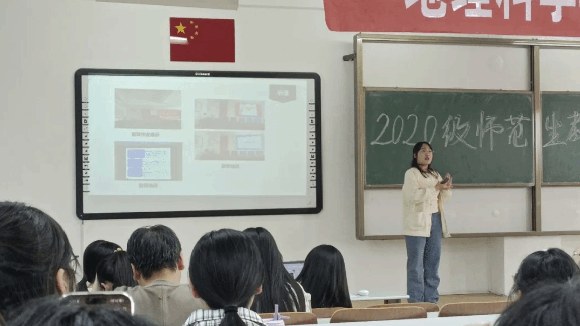 范蓉同学介绍了教学日常任务,也对自身教学经历进行了回顾,为同学们教育实习给出了指南。她也表示在实习中,扮演着地理探索者的角色,带领学生们探寻自然奥秘。同样也深刻体会到,地理教育不仅是知识的传授,更是培养学生对世界的好奇心和理解力,每个学生都是一张未经展开的地图,希望未来的实习生通过讲课,激发学生发现和探索的能力。