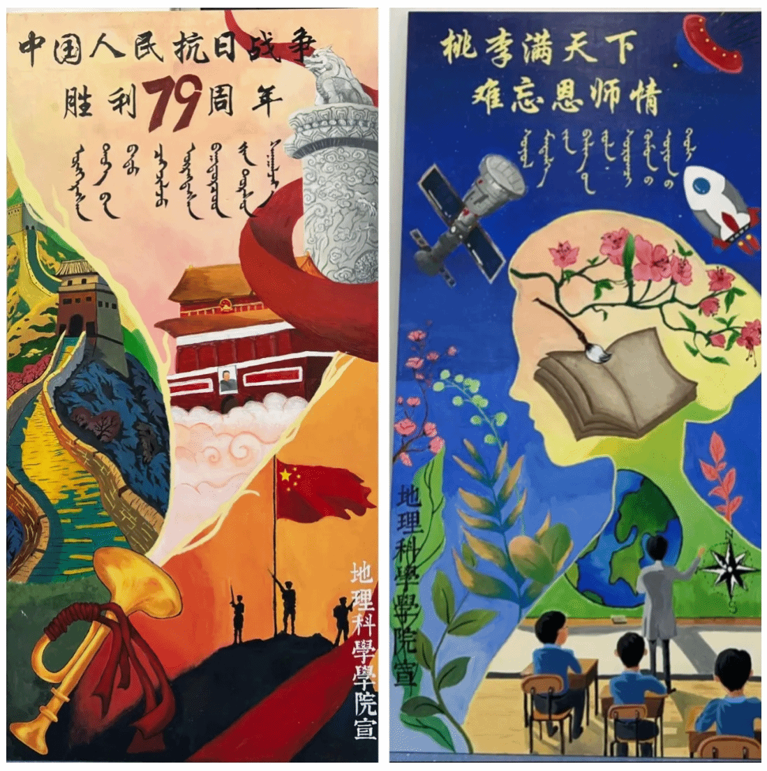 军训期间,太阳军事技能训练板报小组用画笔书写学院的风采,完成了“中国人民抗日战争胜利79周年”与“桃李满天下,难忘恩师情”俩幅作品,以表达抗日战争胜利的民族自豪感和对教师的敬佩之情。