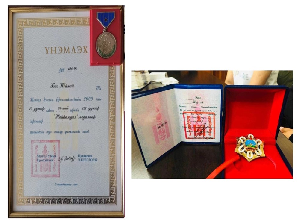 包玉海教授于2008年荣获蒙古国农业部“突出贡献奖”,2009年荣获由蒙古国总统颁发的蒙古国国家荣誉奖(蒙古国授予外国人最高荣誉奖“友谊奖”)。2016年和2020年,布仁吉日嘎拉教授等两人分别荣获蒙古国国家最高荣誉奖“北极星勋章”。