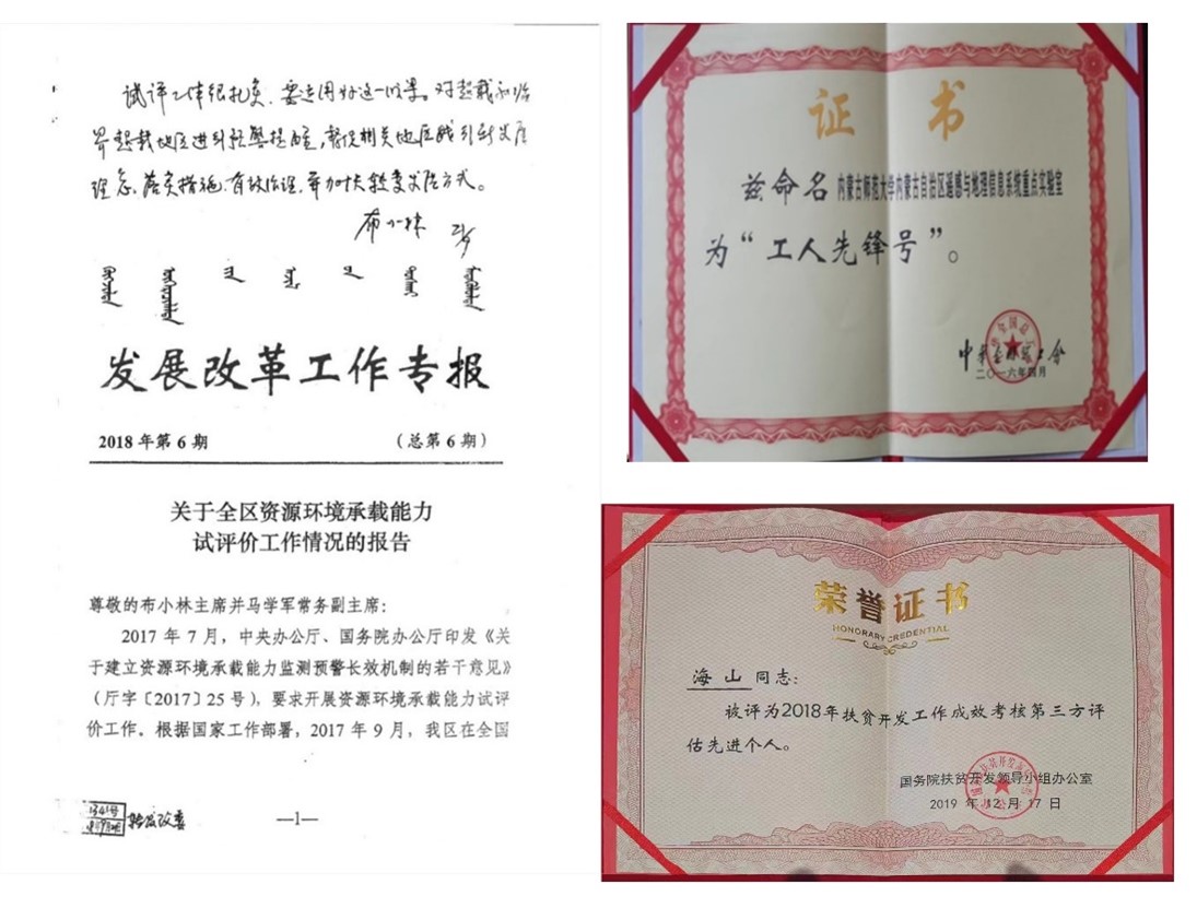 为筑牢中国北方重要生态安全屏障提供技术决策支持。完成了内蒙古自治区主体功能区划、内蒙古自治区资源环境承载能力试评价(自治区原主席布小林批示)、自然灾害监测预警与管理系统的研发应用、退化湿地生态修复技术研发与应用示范、畜牧业产供销一体化服务平台、草原管理服务平台研发与示范和突发性自然灾害实时监测平台等省部委重大委托项目。